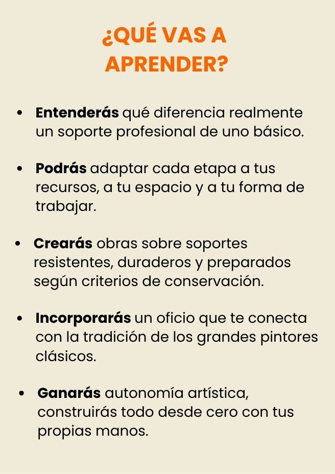 En este módulo aprenderás a preparar tu propio bastidor de tela y sobre tabla, tal como lo hacían los pintores clásicos.
